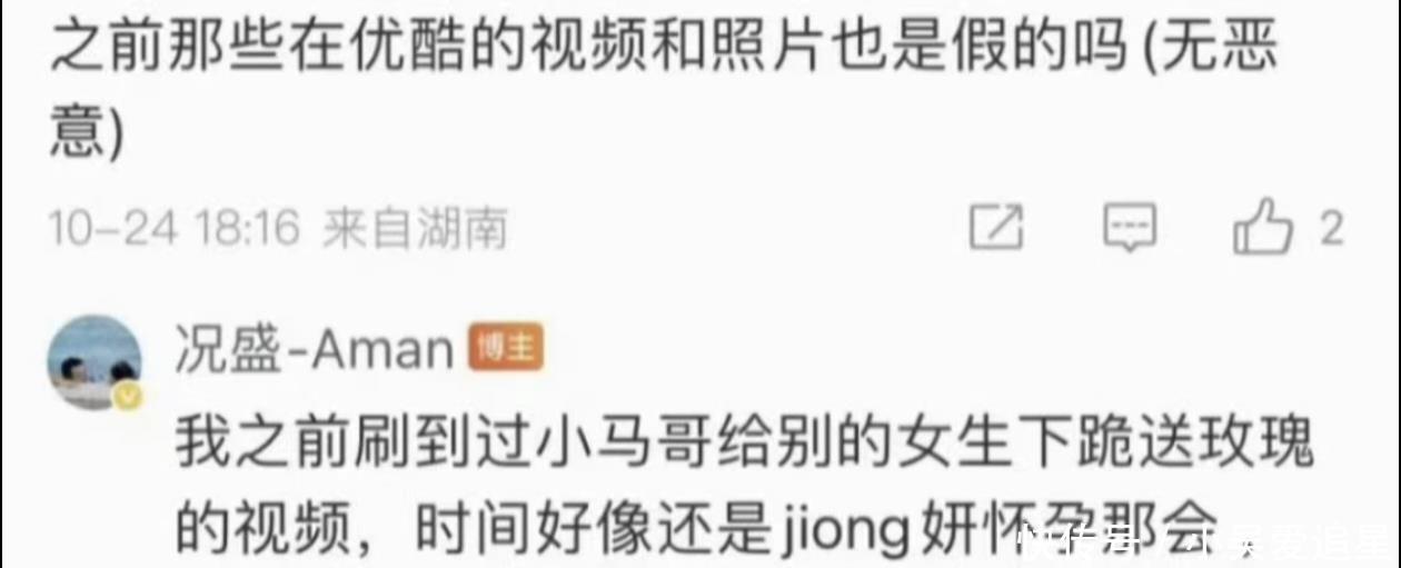 就在今天,况盛回复网友的时候表示“我之前刷到过小马哥给别的女生下跪送玫瑰的视频,时间好像是君妍怀孕那会儿,只是没被扒吧”偏偏在君妍官宣怀二胎的时候出来暗戳戳的说这种话,连大名都不敢带,是生怕人家告你吧。还网友没扒出来,真是小看这届网友了,小马哥要是真有啥,早就被扒了,用不着你况盛在这里倒油。