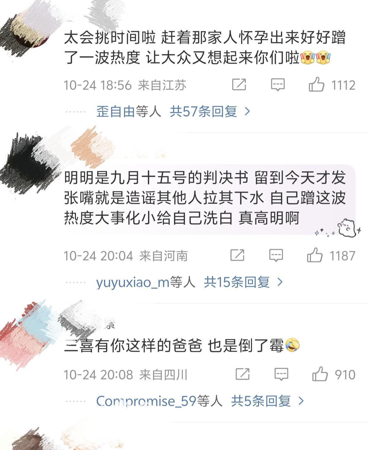 “太会挑时间啦 赶着那家人怀孕出来好好蹭了一波热度 让大众又想起来你们啦”“明明是九月十五号的判决书 留到今天才发张嘴就是造谣其他人拉其下水 自己蹭这波热度大事化小给自己洗白 真高明啊”“三喜有你这样的爸爸 也是倒了霉”网友太会说了,网友就是我的嘴替!