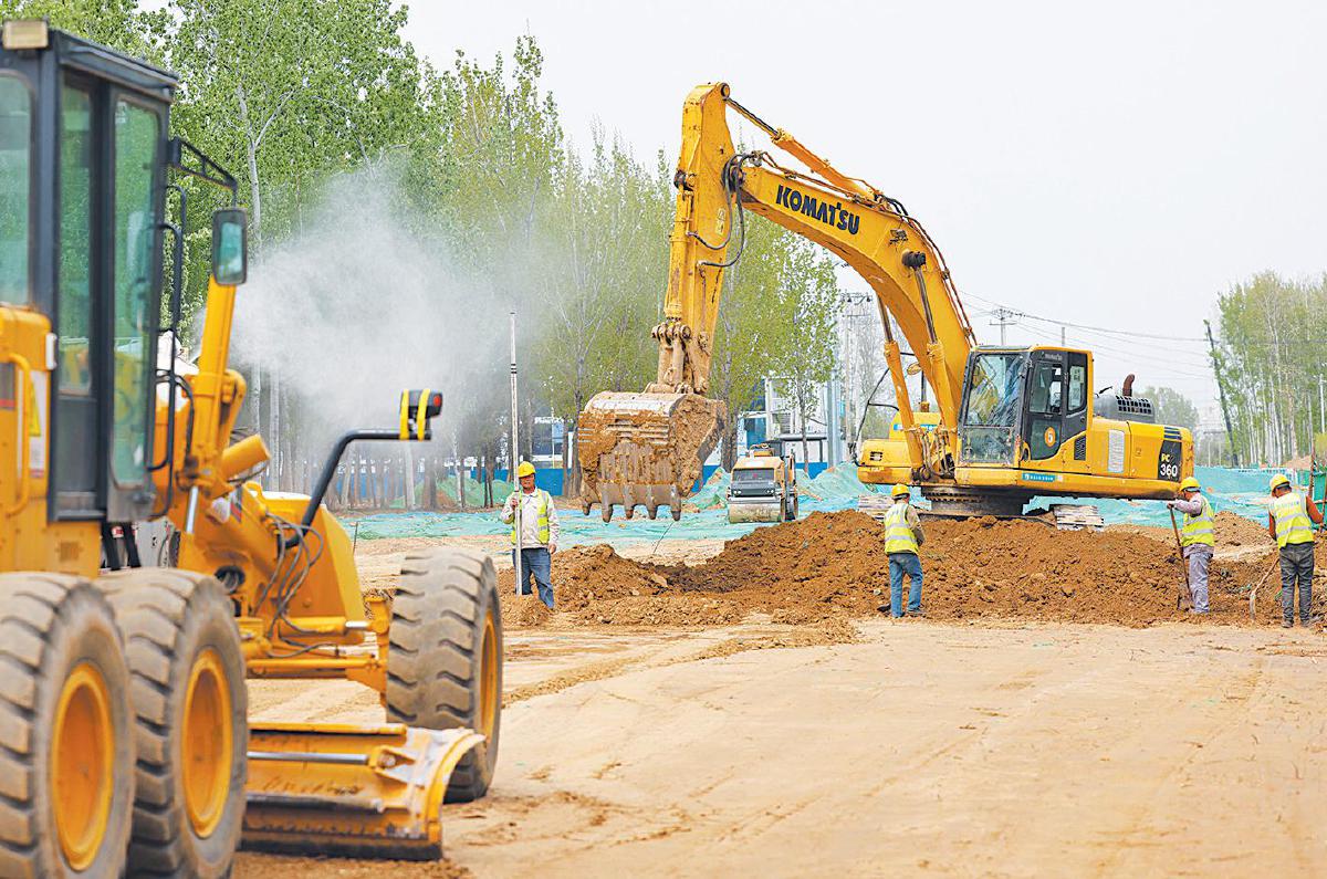 4月13日,上庄东路北延道路工程,工人正在施工作业。新京报记者 王贵彬 摄
